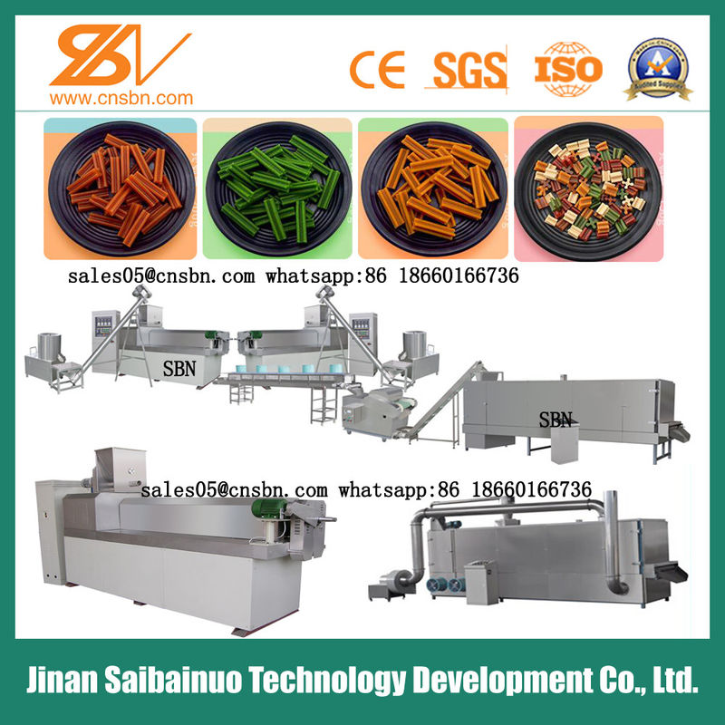 Thỏi nhai chó lấy tinh bột làm nguyên liệu thô với cấu hình khoa học và được ép ra từ co-extruder, nó có thể được làm thành nhiều hình dạng như gậy, xương, hai màu, hai hương vị, vvLoại thực phẩm này không chỉ cung cấp protein, chất béo, vitamin, dinh dưỡng cho chó, nhưng cũng thỏa mãn sở thích thiên nhiên của chó.